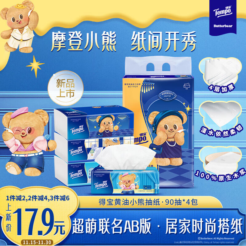 得宝(TEMPO)黄油小熊联名抽纸4层90抽*4包 纸巾 餐巾纸 卫生纸
