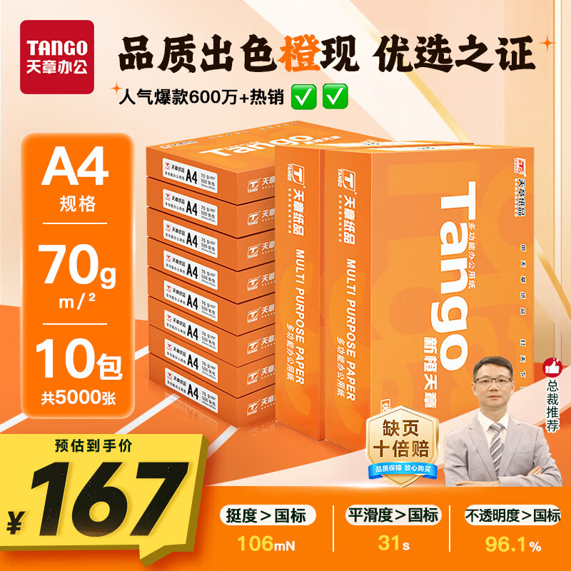 天章 (TANGO)新橙天章A4打印纸 70g 500张*10包 双面打印复印纸 顺滑畅打高性价比 整箱5000张【明星品质款】