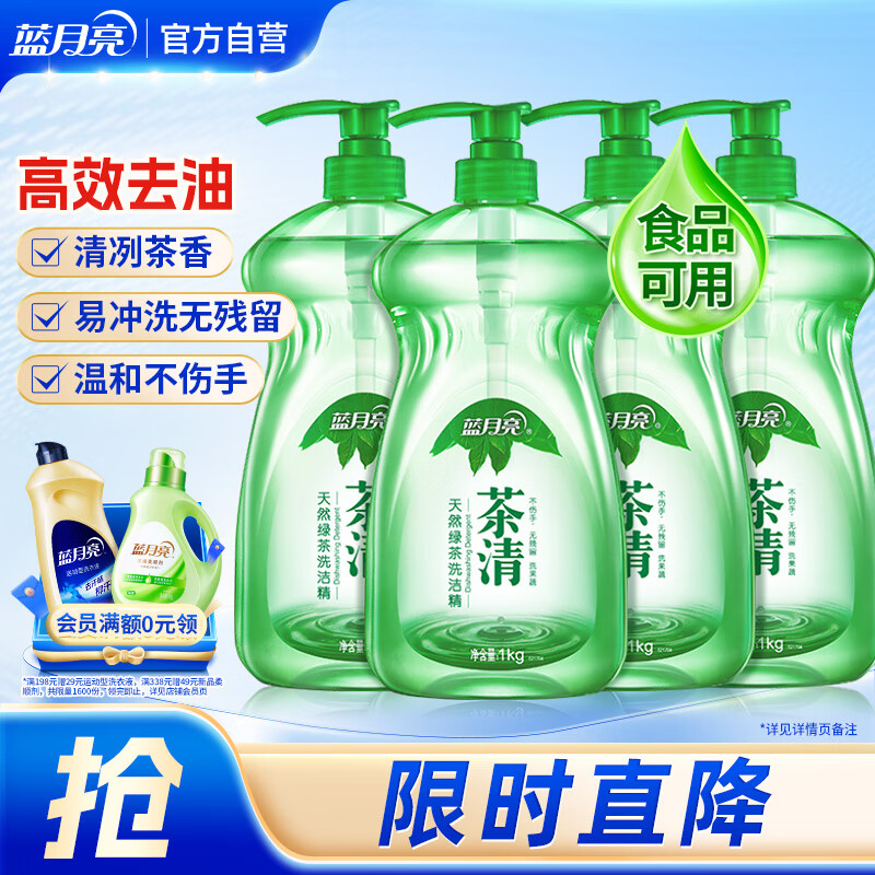 蓝月亮茶清洗洁精1kg*4瓶 果蔬餐具清洗剂洗涤灵 食品可用 高效去油