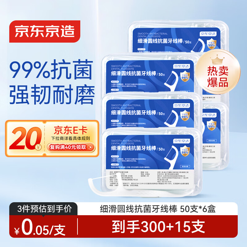 京东京造抗菌细滑圆线牙线棒50支*6盒 剔牙牙签牙线棒(赠15支薄荷味)