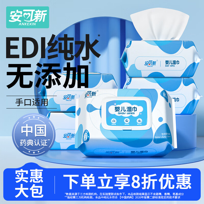 安可新 婴儿湿巾【80片*5包】一次性手口湿纸巾新生儿专用纸巾纯水带盖