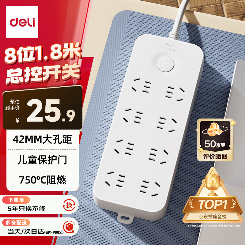 得力(deli)3C认证国标安全插座 插线板/插排/排插/插板/接线板/拖线板延长线 总控开关 8位1.8米 LU9052(1.8)