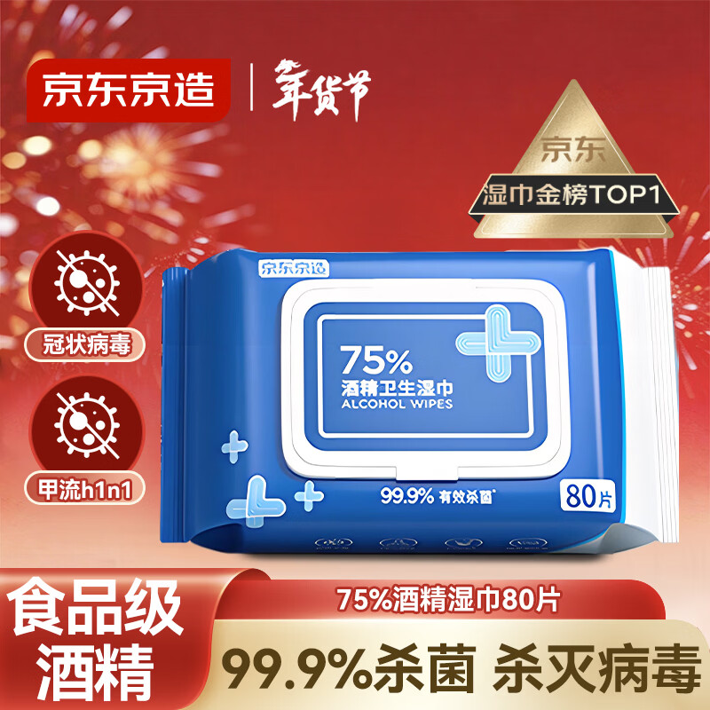 京东京造 75%酒精湿巾80片 杀菌湿巾纸 湿纸巾 卫生湿巾 消毒湿巾