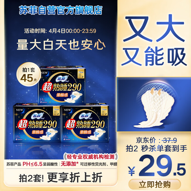 苏菲超熟睡柔棉感超长日夜用姨妈巾卫生巾29cm45片京东自营官方旗舰