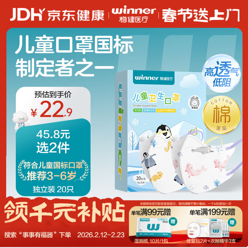 稳健棉里层儿童口罩3-6岁独立装一只一袋20只亲肤透气防尘秋冬季保暖