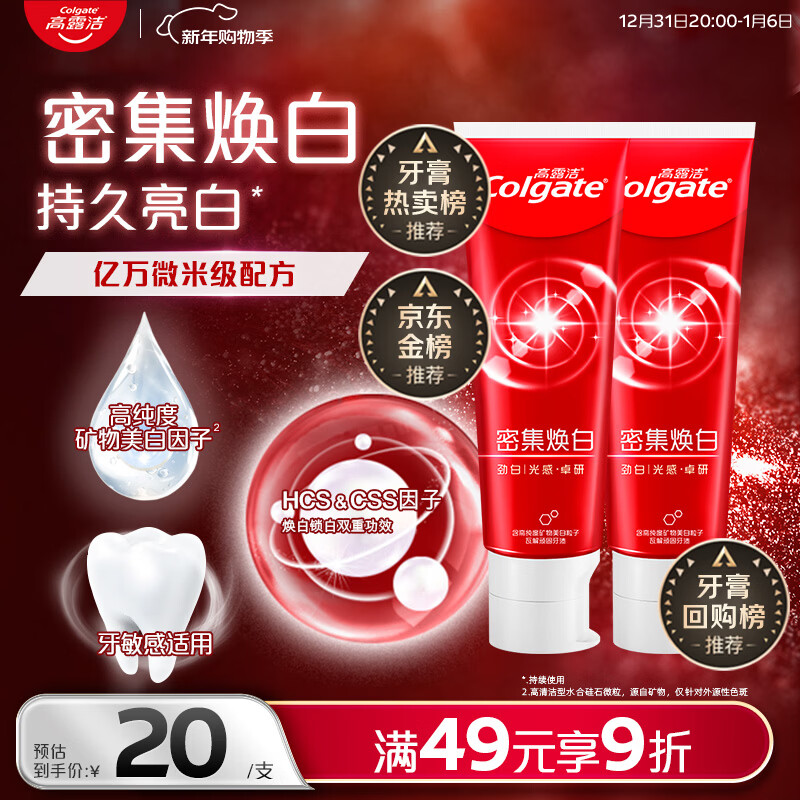 高露洁(Colgate)密集焕白美白牙膏去牙渍亮白牙齿含氟清新口气清爽薄荷味120g*2