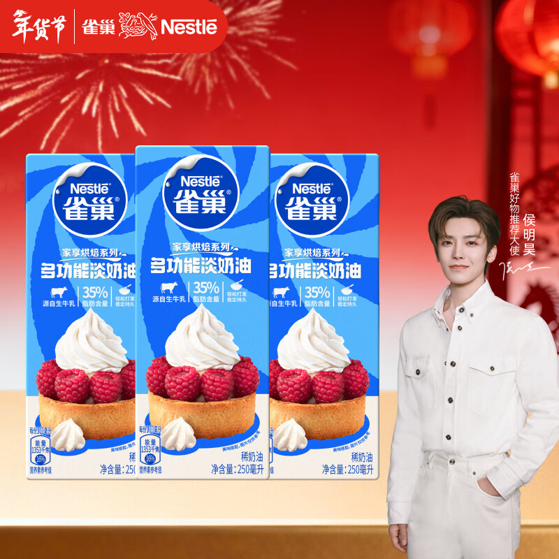 雀巢(Nestle)【侯明昊推荐】烘焙原料淡奶油常温存储易打发蛋糕淡奶油250ml*3