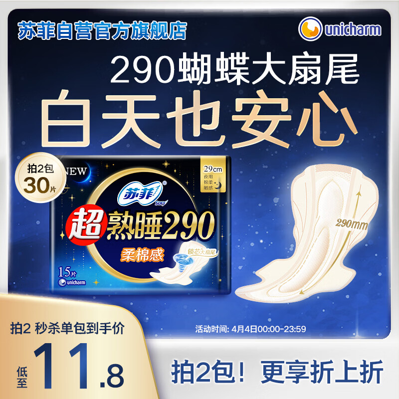 苏菲超熟睡柔棉感夜用卫生巾29cm15片量多防漏干爽姨妈巾自营官方旗舰