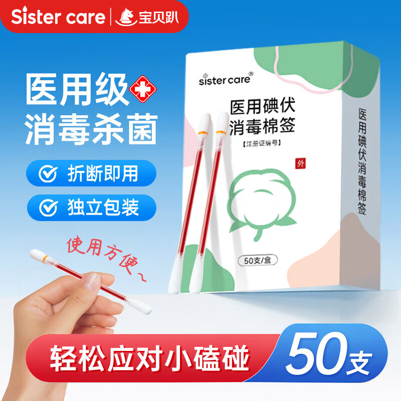 sister care医用碘伏消毒液棉棒50支新生儿婴儿碘伏棉签成人儿童肚脐伤口消毒