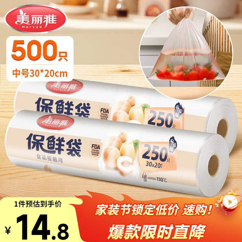 美丽雅保鲜袋食品级中号500只30*20cm冰箱塑料袋子加厚食品密封袋