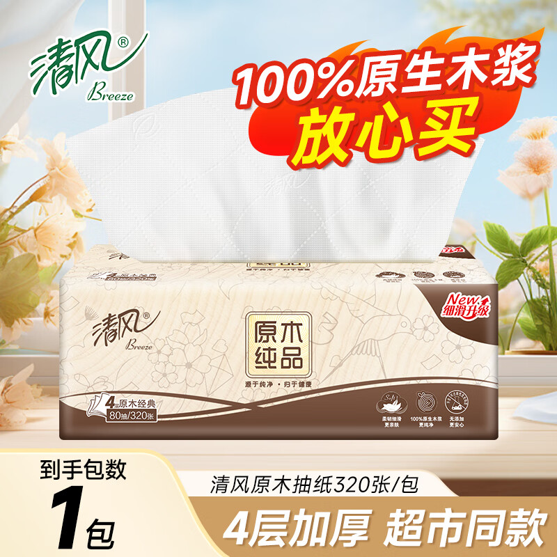 清风抽纸家用卫生纸整箱批发纸巾学生宿舍湿水不易破4层加厚原木纯品 4层 80抽*1包