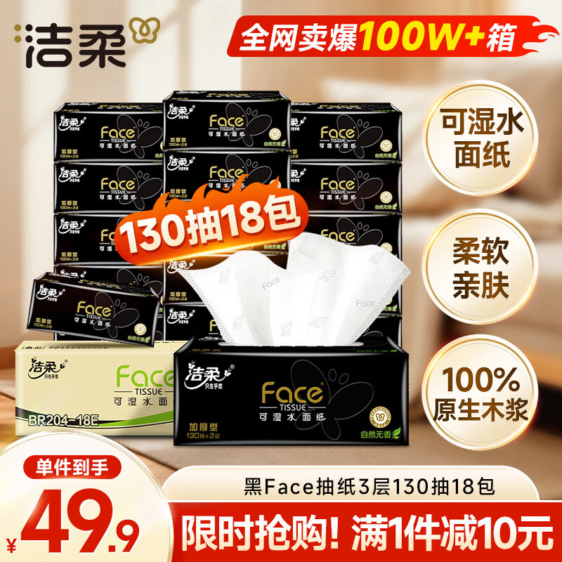 洁柔抽纸 黑Face3层130抽*18包 无香 可湿水面巾纸 整箱纸巾 热门商品