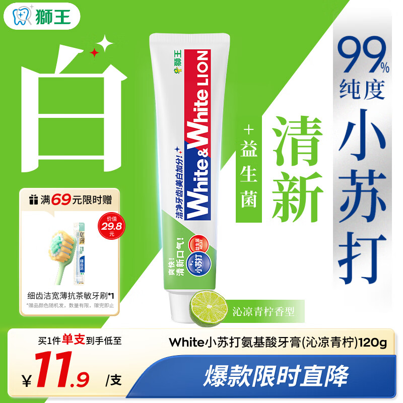 狮王(Lion)WhiteWhite小苏打青柠牙膏美白亮白护龈120g抑菌去口臭去黄去牙渍