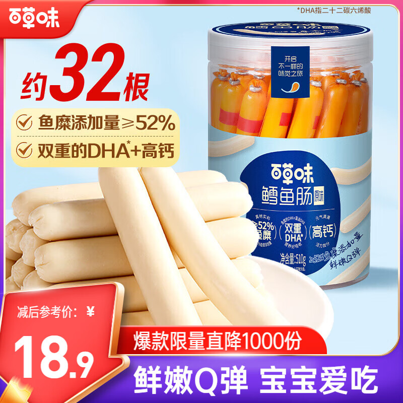 百草味高钙鳕鱼肠罐装32根510g宝宝休闲零食火腿肠