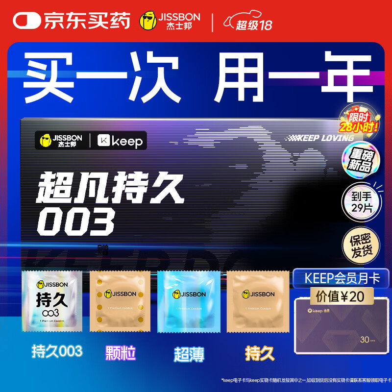 杰士邦延时避孕套超凡持久003礼盒29片(含湿巾)安全套套超薄男专用