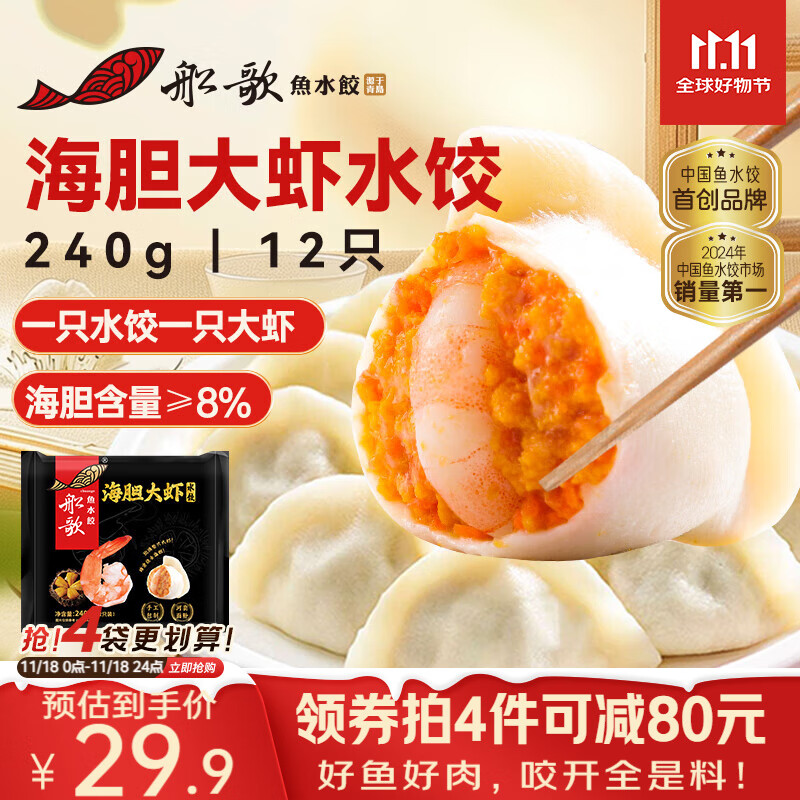 船歌鱼水饺 海胆大虾水饺240g12只 健康早餐夜宵 海鲜手工速冻饺子 生鲜速食