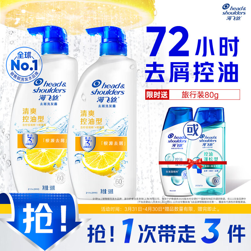 海飞丝去屑洗发水男士女士清爽去油500g*2+80g洗头膏控油蓬松洗发水套装