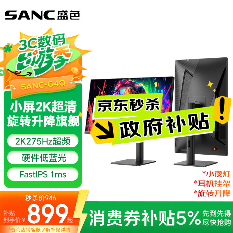 SANC盛色24.5英寸2K275Hz FastIPS显示器1ms 硬件低蓝光 耳机挂架小夜灯 升降支架电竞电脑屏幕G4Q