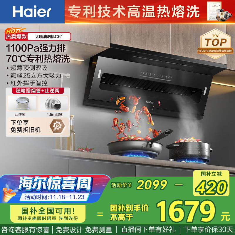 海尔(Haier)油烟机 国家补贴20%抽吸排油烟机 顶侧双吸三吸大嘴C61 家用齐平橱柜变频25m3烟机【性价比首选】