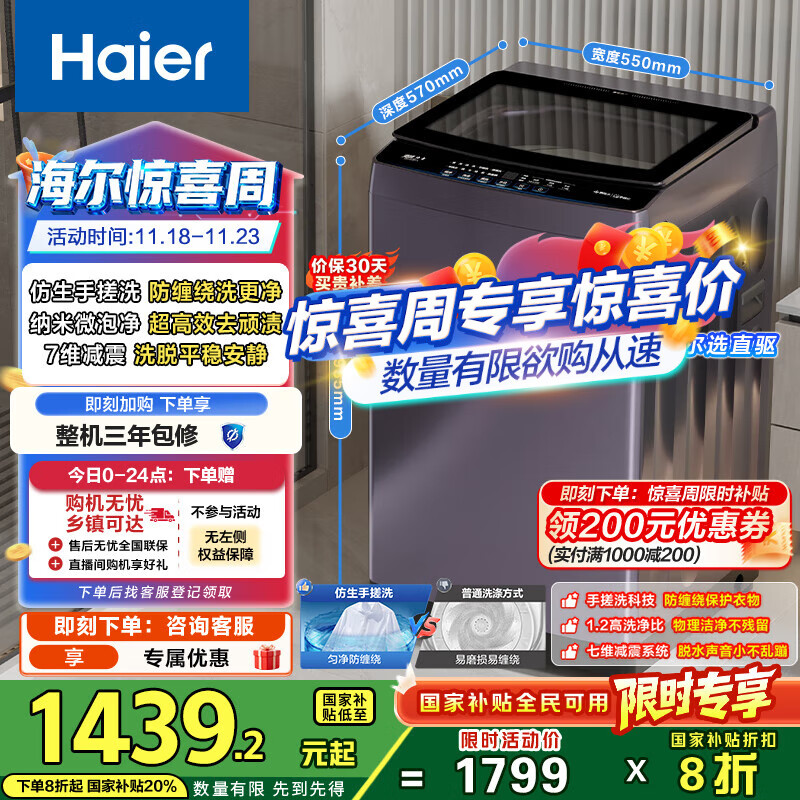 海尔(Haier)波轮洗衣机全自动家用10公斤手搓洗防缠绕XQB100-BS629 一级能效京东自营家电国家补贴20%