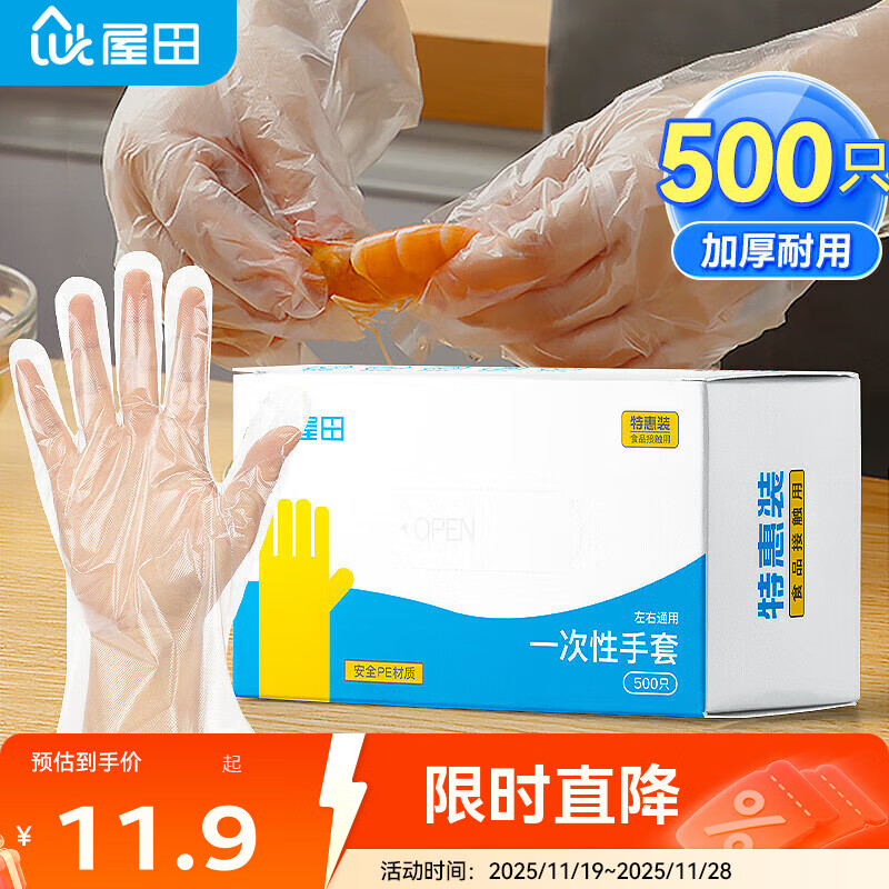 屋田一次性手套食品级500只盒装抽取式加厚塑料PE防漏手套厨房烘焙