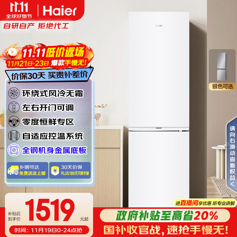 海尔(Haier)285升风冷无霜小冰箱双开门一级小户型家用冰箱租房办公室冷藏冷冻BCD-285WGHC2DEWV