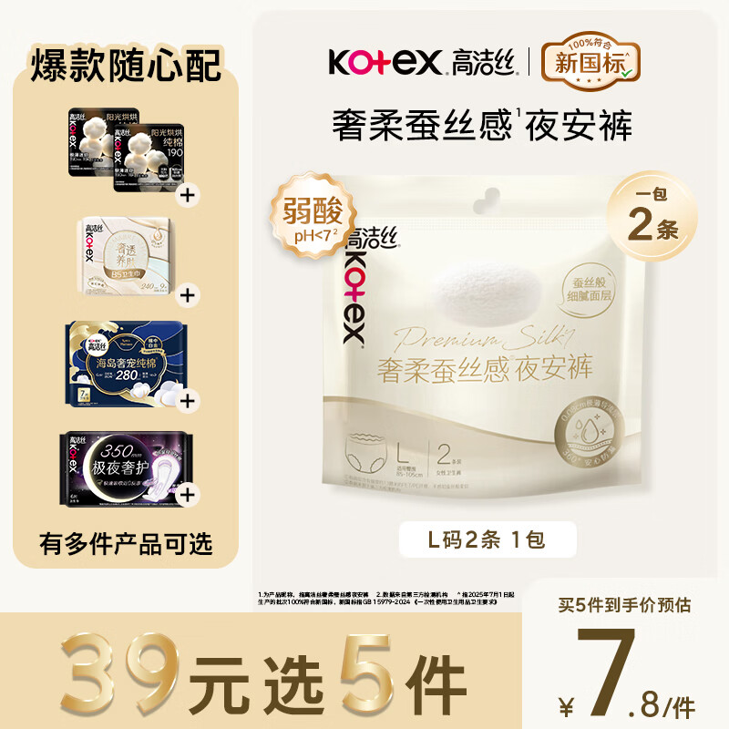 高洁丝【39元任选5件】顶配柔软蚕丝感夜安裤L号2条裤型卫生巾
