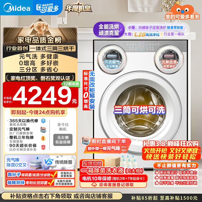 美的(Midea)可爱多滚筒洗衣机全自动 带烘干洗烘一体 11KG三筒内衣洗 三桶年度机皇MD11DDEX 以旧换新国家补贴