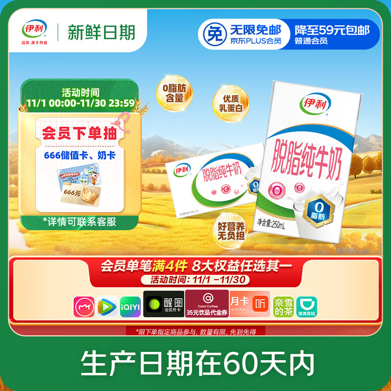 伊利【新鲜日期】脱脂纯牛奶250ml*24盒 零脂肪好营养 礼盒装