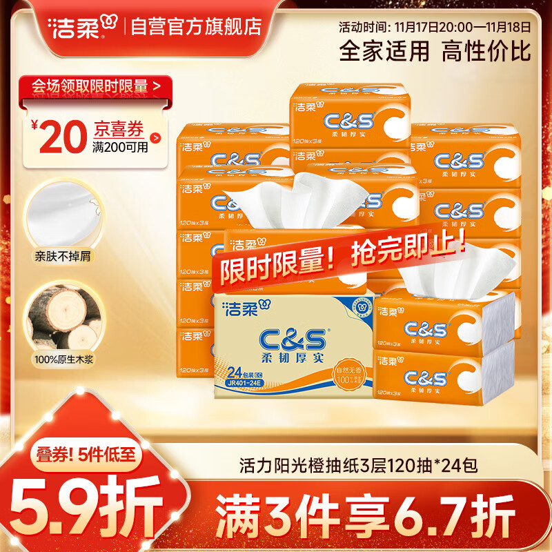 洁柔抽纸 活力阳光橙3层120抽*24包 母婴可用 全家适用 面巾纸 整箱