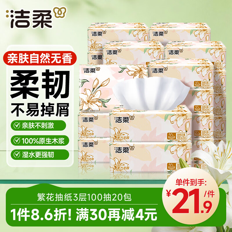 洁柔抽纸 繁花系列3层100抽*20包 可湿水面巾纸 柔韧卫生纸 整箱纸巾