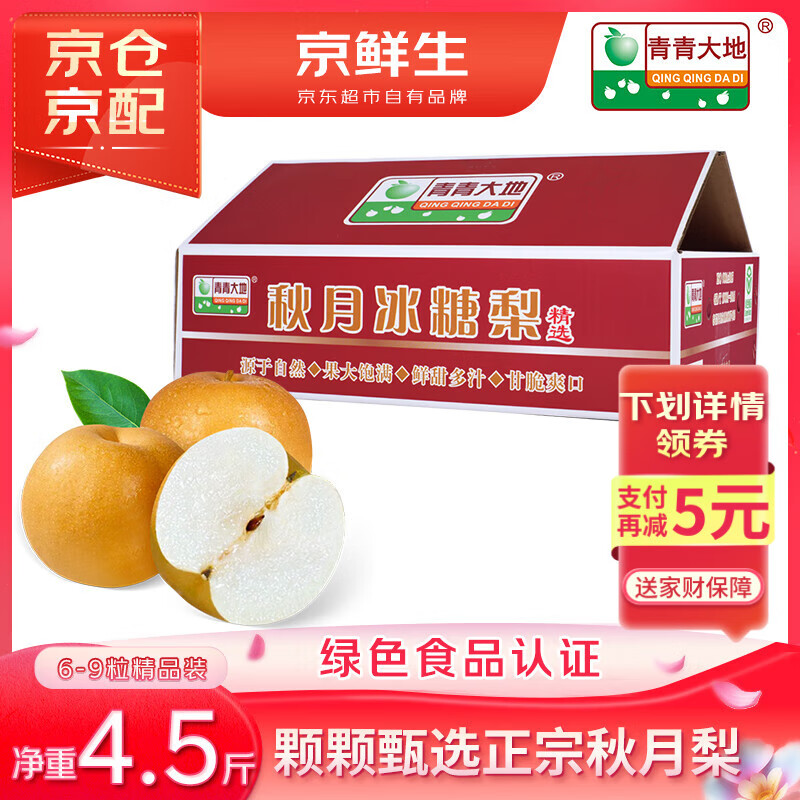 京鲜生 青青大地莱阳羊脂秋月梨 净重4.5斤 6-8粒 生鲜水果 礼盒装