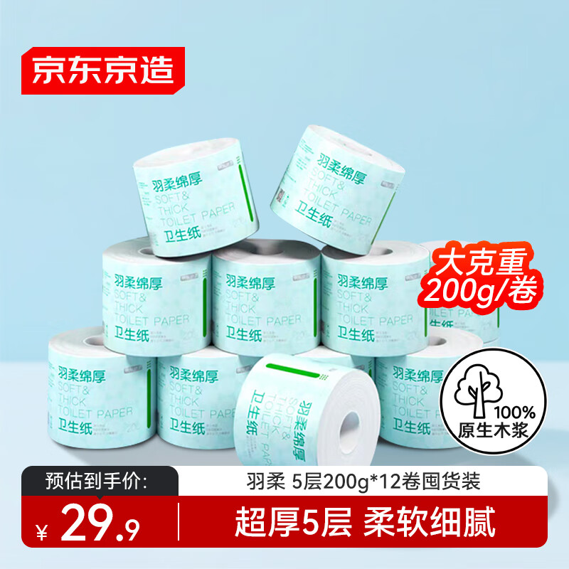 京东京造羽柔有芯卷纸五层加厚200g*12卷 卫生纸巾卷筒纸手厕纸