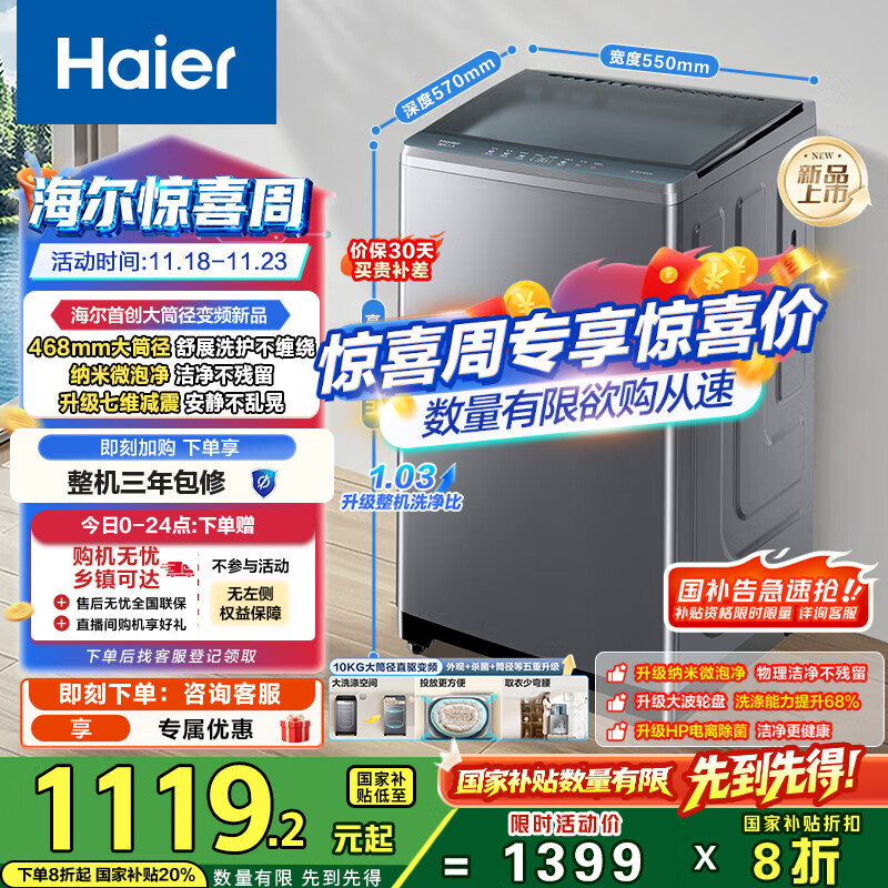海尔(Haier)波轮洗衣机全自动家用10KG大容量超薄大筒径【XQB100-BZ23D0】直驱变频一级能效以旧换新抗菌除螨
