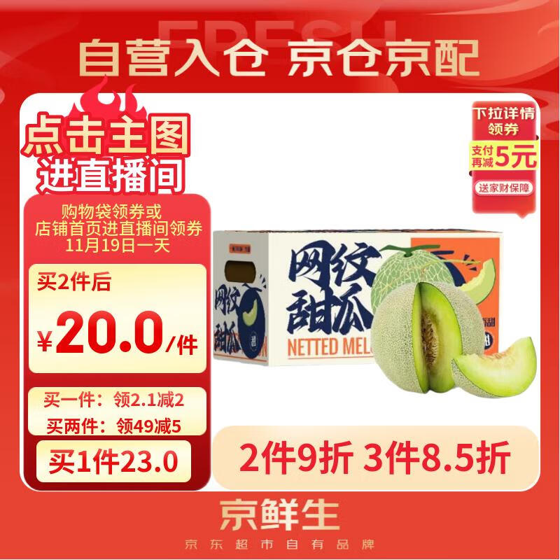 京鲜生 网纹蜜瓜 2粒装 净重4-5斤 单果2斤起 生鲜水果礼盒
