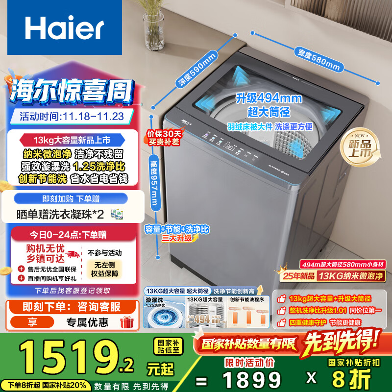 海尔(Haier)波轮洗衣机全自动13公斤超大容量家用XQB130-BZ53D直驱变频一级能效京东自营家电国家补贴以旧换新