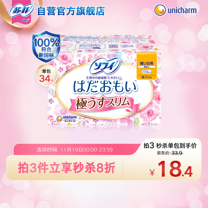 苏菲温柔肌轻柔进口日用迷你卫生巾175mm34片 护垫超薄敏感肌姨妈巾