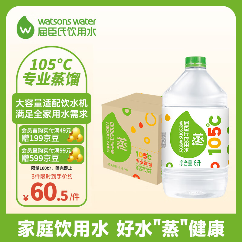屈臣氏蒸馏水纯净水6L*4桶整箱大桶装水饮用水家庭装泡茶煲汤