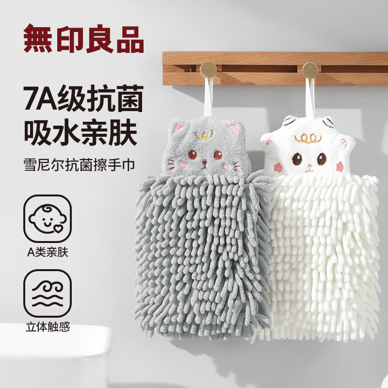 无印良品雪尼尔擦手球2条擦手毛巾厨房卫生间可爱抗菌不易掉毛擦手巾灰+白