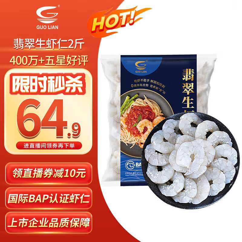 GUO LIAN国联 翡翠生虾仁海鲜去冰净重2斤 156-198只去虾线【400万+好评】