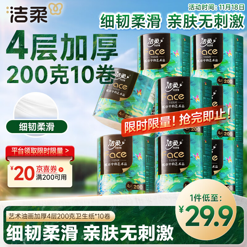 洁柔有芯卷纸艺术油画Face4层200克*10卷卫生纸卷筒纸巾整箱开学必备