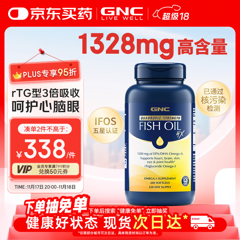 GNC健安喜高纯度深海鱼油omega3 dha 鱼油降血脂非鱼肝油中老年240粒