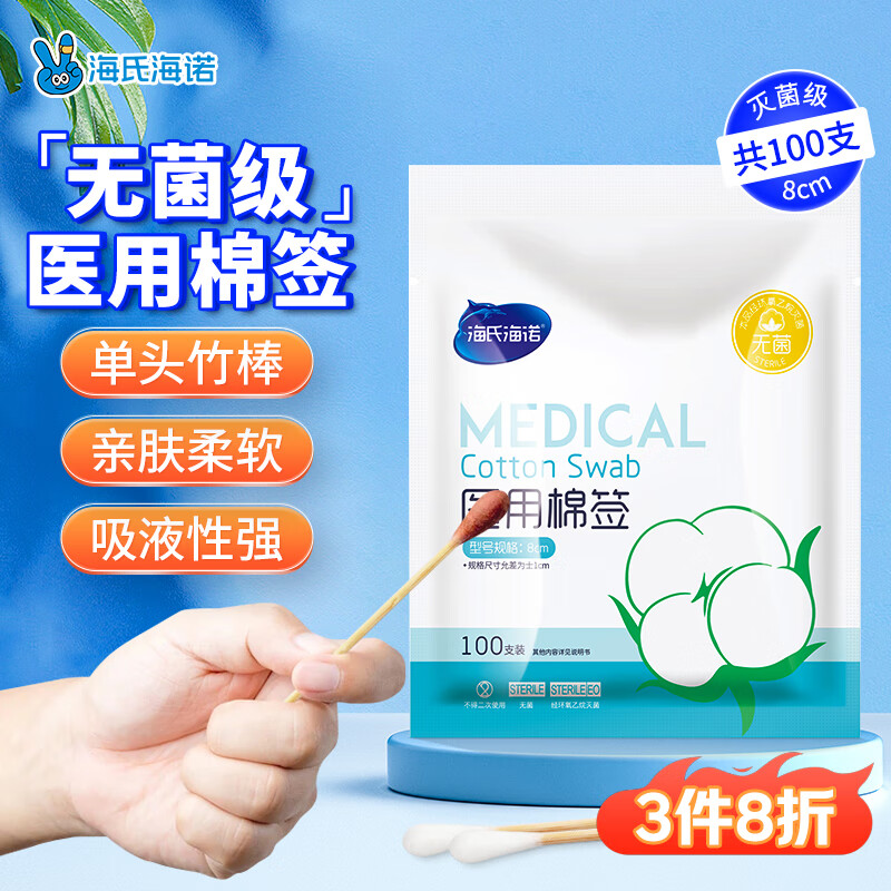 海氏海诺医用棉签 消毒棉签棒无菌 8cm*100支凑单消毒掏耳鼻清洁成人婴儿