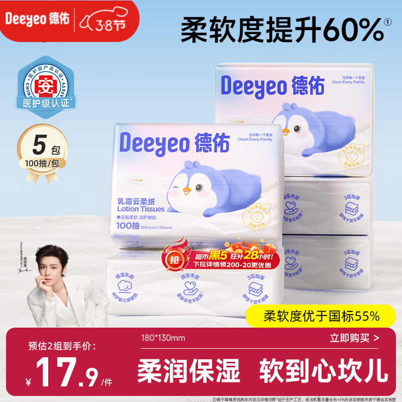 德佑云柔巾婴儿适用乳霜纸柔纸巾抽纸宝宝云柔巾100抽5包