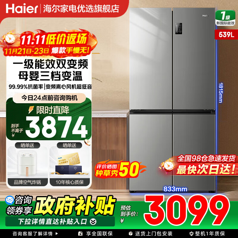 海尔冰箱539升十字双开门四开门家用冰箱一级能效风冷无霜超薄538/539L大容量冰箱 539L丨黑金净化抗菌丨WIFI一键联网