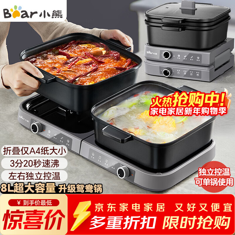 小熊(Bear)电火锅分区控温鸳鸯锅火锅专用锅家用分体多功能锅折叠易收纳3分20秒速沸E80H5 8L叠叠锅2.0火锅版