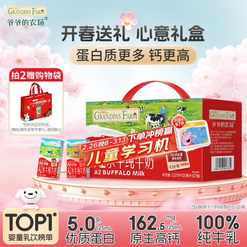 爷爷的农场A2水牛纯牛奶125ml*27盒 儿童早餐水牛奶宝宝年货礼盒整箱送礼