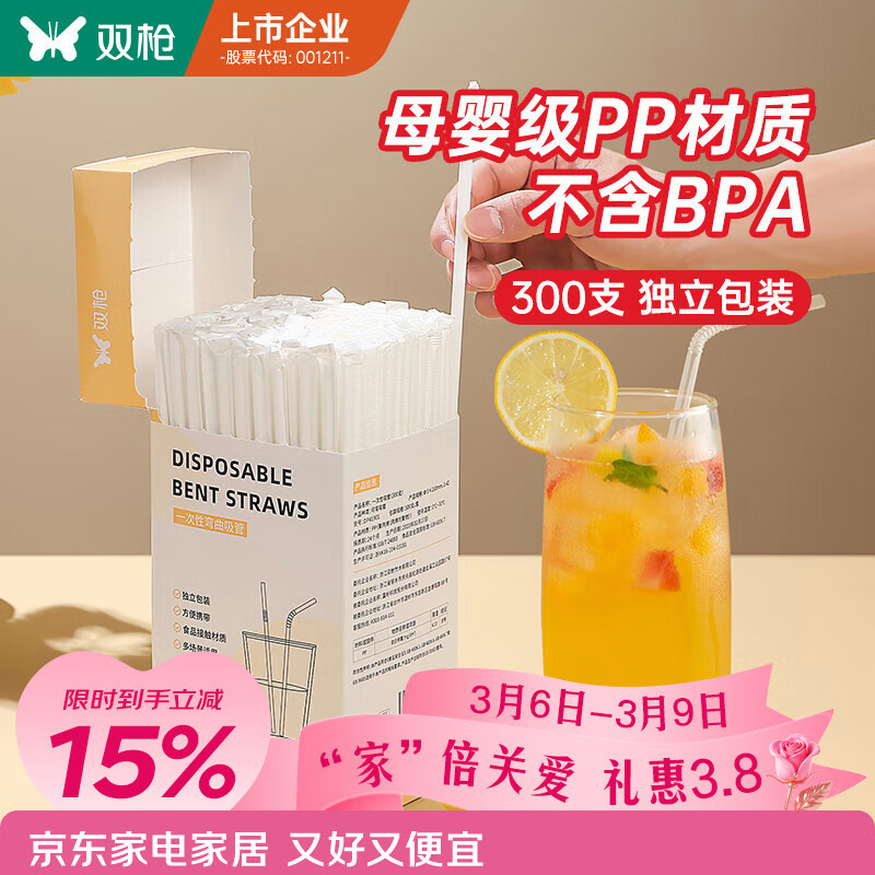 双枪一次性吸管单独包装儿童产妇食品级平口塑料透明细弯吸管300只