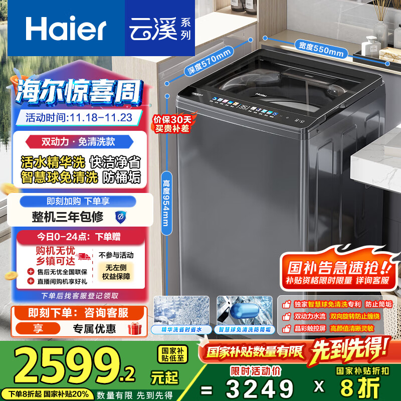 海尔(Haier)云溪波轮洗衣机全自动10公斤双动力免清洗EMS100B37Mate6直驱变频京东自营家电国家补贴一级能效