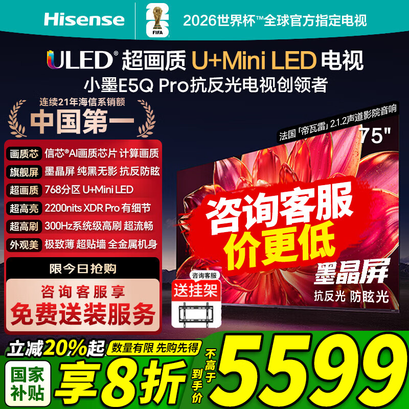 海信电视小墨E5Q Pro75英寸 768分区U+MiniLED 信芯芯片 抗反光防眩光墨晶屏300Hz 75E5Q-PRO 国家补贴 75英寸 咨询客服有惊喜